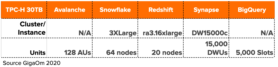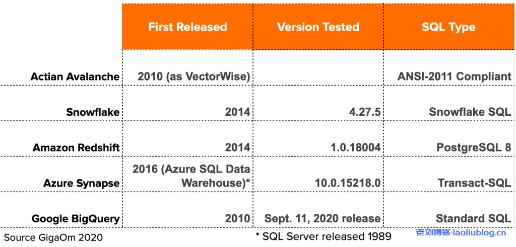 最近随着Snowflake上市后市值的暴增(目前700亿美金左右),整个市场对原生云数仓都关注起来。近日,一家第三方叫GigaOM的公司对主流的几个云数仓进行了性能的对比,包括Actian Avalanche、Amazon Redshift、Microsoft Azure Synapse、Google BigQuery、Snowflake,基本涵盖了目前市场上主流的云数仓服务。
