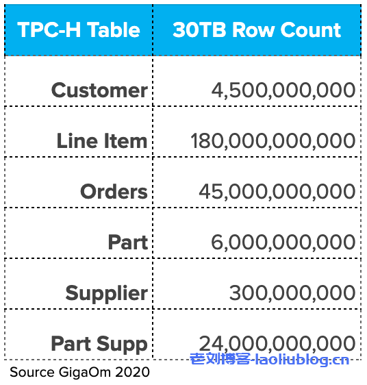 本次测试场景选取的是30TB的TPC-H,比较有趣的是在2019年的benchmark中GigaOM选取的是30TB的TPC-DS。要知道,TPC-DS有99个SQL,而TPC-H只有22个,而且TPC-DS的模型要比TPC-H复杂,那为啥本次不选择更加通用的TPC-DS呢?