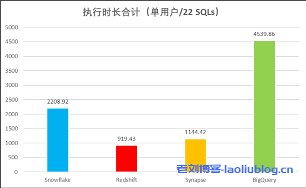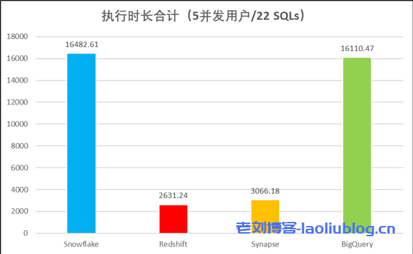 但这并不是本文要分析的重点,其实,其它4家的产品,Snowflake / Redshift / Synapse / BigQuery,才是市场上最常见和使用最广泛的云数仓产品。所以我决定将Actian从测试结果中去掉,比较一下这4家的性能数据。结果如下: