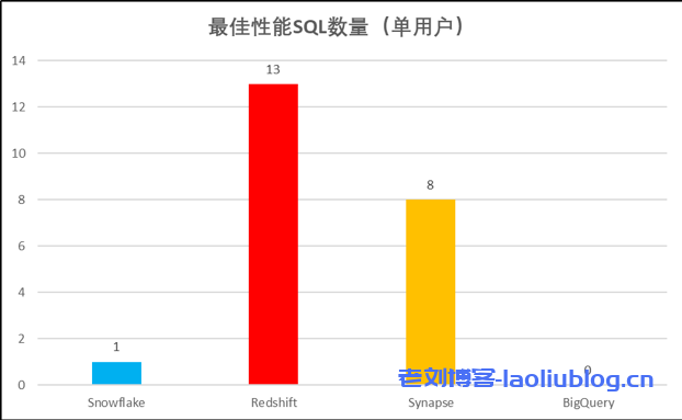 最佳性能SQL的数量:横向比较22个场景,挑选出每个场景的最佳(执行时长最短)。Redshift有13条SQL执行时间最短,Synapse有8条,Snowflake只有1条,而BigQuery没有。