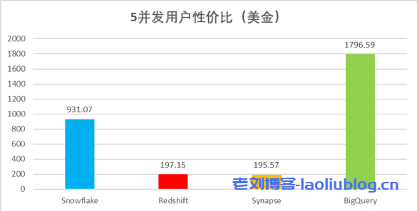 并发用户性价比:Synapse最便宜,其次是Redshift,然后是Snowflake和BigQuery。