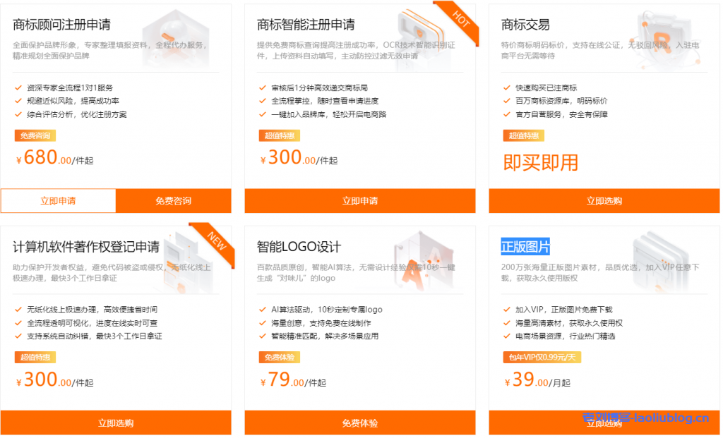 包括商标顾问注册申请、商标智能注册申请、商标交易、计算机软件著作权登记申请、智能LOGO设计和正版图片等,具体服务内容及价格如下: