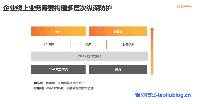 除此之外,面对愈发严峻的网络安全态势,为了应对安全风险,企业在关注线上业务的流畅、稳定的同时,也要构建多层次纵深防护体系,在网络层、传输层、应用层等多层次构建防护能力,同时在应用层,对于不同场景要有不同防护措施。