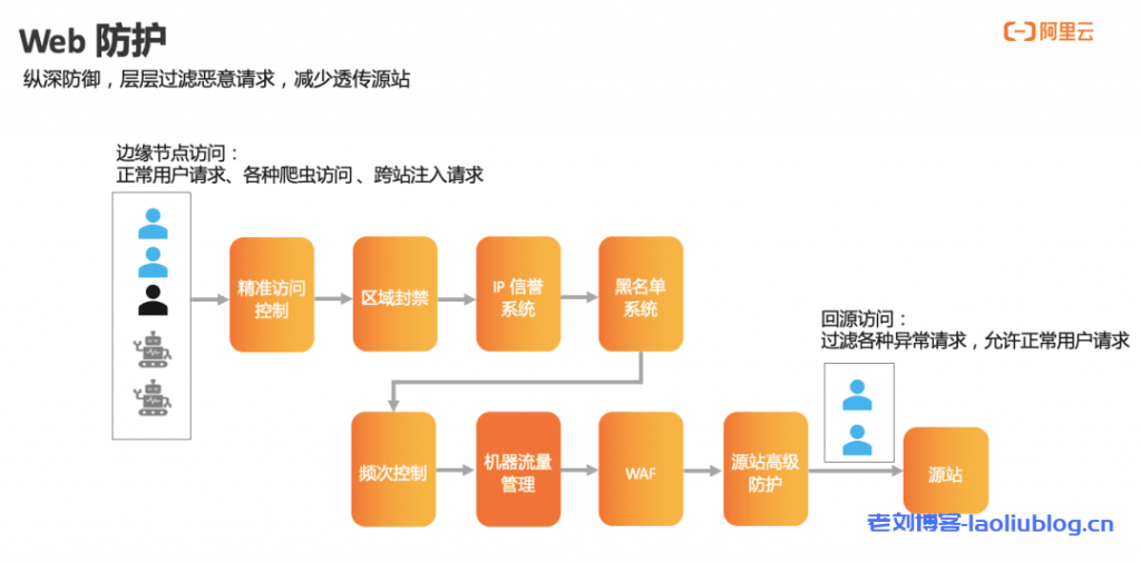 Web防护的策略是通过层层过滤,来抵御恶意请求。第一层是精准访问控制,指具体对http请求的拦截策略;第二层是区域封禁,对业务无效区或者异常地域请求进行拦截;第三层IP信誉系统,是利用阿里云多年积累的互联网IP大数据画像,对恶意行为进行分类并对IP进行拦截;第四层是黑名单系统,是对某些UA或者IP进行拦截,以上四层都属于精确拦截;第五层是频次控制,对相对高频且访问异常IP进行拦截;第六层是对于互联网机器流量进行管理,阻断恶意爬虫;第七第八层是WAF和源站高级防护,对于源站进行更深层次的防护。