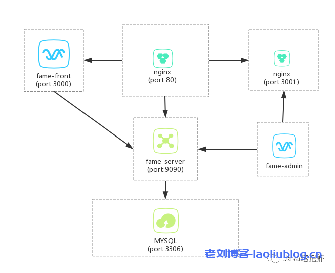 ├─Fame │ │ .env // docker-compose环境参数配置文件 │ │ docker-compose.yml // docker-compose文件 │ ├─fame-docker │ │ │ fame-front-Dockerfile // fame-front的Dockerfile文件 │ │ │ fame-server-Dockerfile // fame-server的Dockerfile文件 │ │ │ │ │ ├─fame-admin │ │ │ fame-admin-Dockerfile // fame-admin的Dockerfile文件 │ │ │ nginx.conf // fame-admin的nginx服务器配置文件 │ │ │ │ │ ├─fame-mysql │ │ │ fame-mysql-Dockerfile // mysql的Dockerfile文件 │ │ │ mysqld.cnf // mysql的配置文件mysqld.cnf │ │ │ │ │ └─fame-nginx │ │ nginx-Dockerfile // 整个项目的nginx服务器的Dockerfile文件 │ │ nginx.conf // 整个项目的nginx的配置文件 │ │ │ ├─fame-admin // 博客管理后台,基于Vue+elementui │ ├─fame-front // 博客前端,基于Nuxt │ └─fame-server // 博客服务端,基于spring-boot