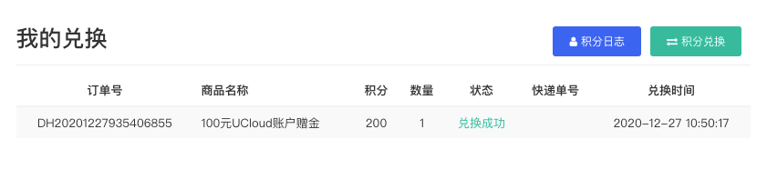 再加上目前 UCloud 的活动,最低 62 购买一年,所以我只能等 200 积分的时候兑换,每天积分获得上限是 20,所以 200 积分 坚持 10 天就可以搞定,算不算免费兑换服务器呢?