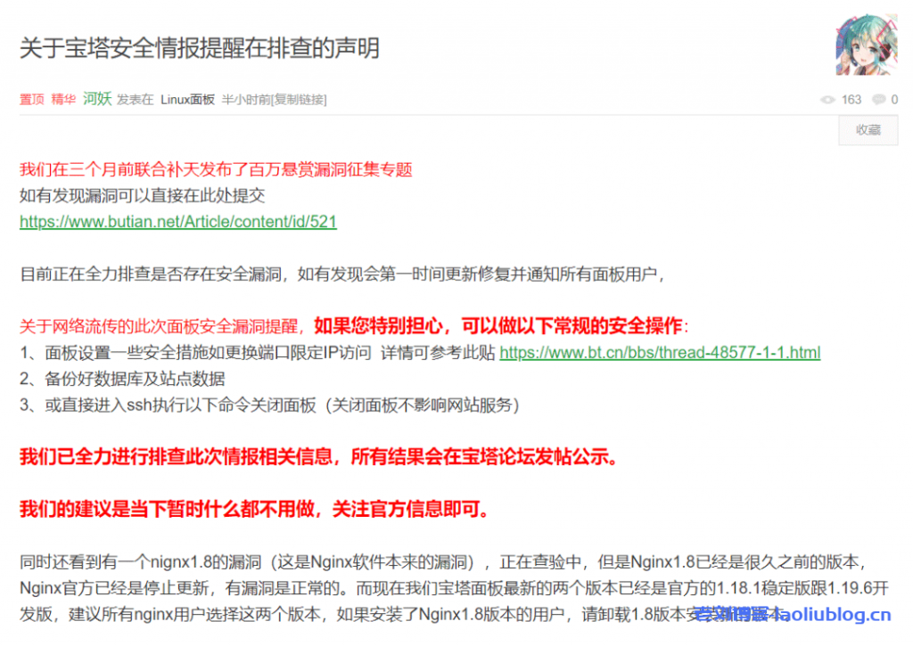 宝塔官方在宝塔论坛发布的《【置顶】关于宝塔安全漏洞的声明》,经过仔细阅读,老刘这里建议针对性处理一下。宝塔官方公告原文链接 https://www.bt.cn/bbs/thread-61706-1-1.html