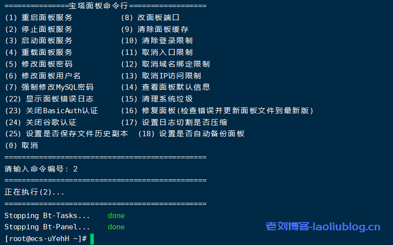 7,如果你还是非常担心和害怕,等所有环境调试好后,通过 SSH 输入bt执行2选项(输入2回车即可)停止宝塔面板服务(不影响网站运行)。等需要用的时候再输入bt执行3选项(输入3回车即可)启动宝塔面板服务。