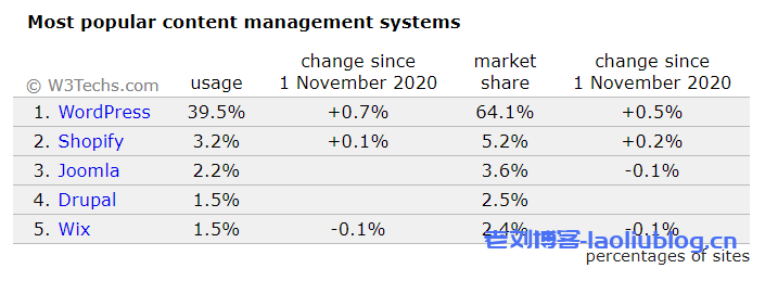 W3Techs最新数据显示,2021年全世界39.5%的网站使用WordPress搭建,而2020年WordPress的占比是35%。