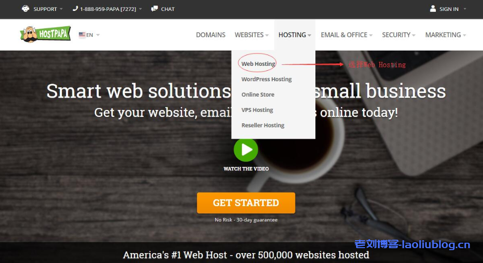 首先通过 HostPapa 的最新优惠链接进入其官网首页,然后选择“Web Hosting”,如下图所示: