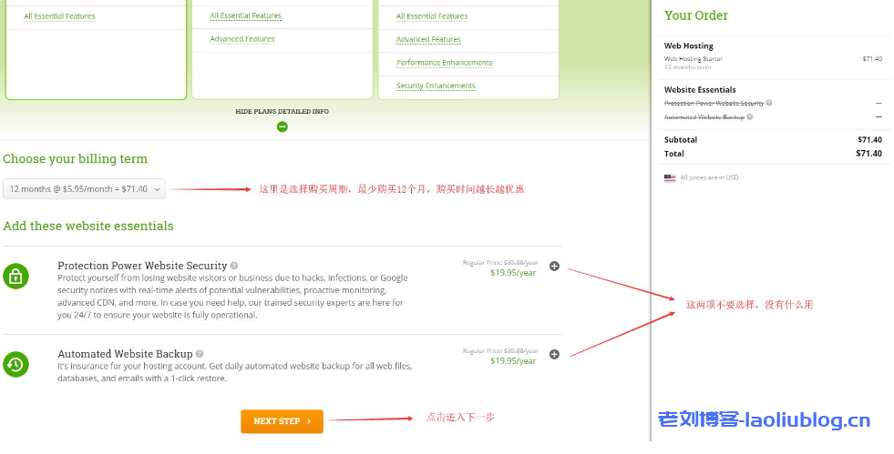 跳转后,往下滑动,选择购买周期,最少购买一年,购买时间约长就越优惠,然后去掉下面的附加选项,没有什么用,都是主机公司为了多赚钱的,如下图所示: