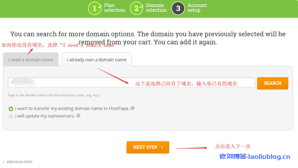 跳转后就是设置域名了,使用虚拟主机部署网站肯定是需要一个域名的,如果你没有域名,你选择注册一个域名,如果有了域名你就输入你的域名,如下图所示: