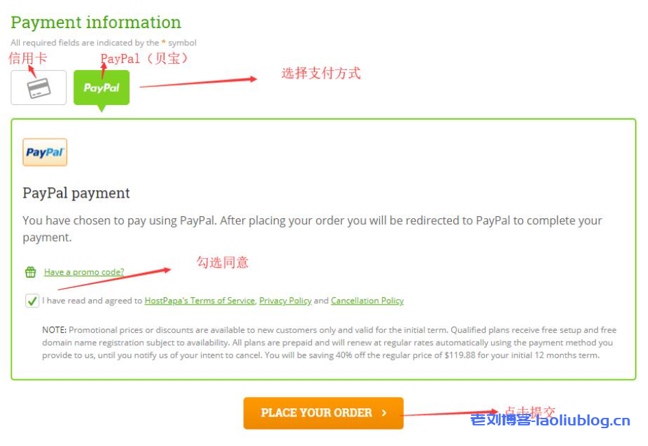 然后选择支付方式,可以支持信用卡或者PayPal付款,然后勾选同意协议,如下图所示: