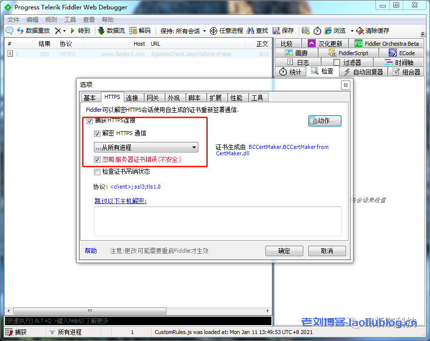 Fiddler-工具-选项-HTTPS,勾选以下三个选项: