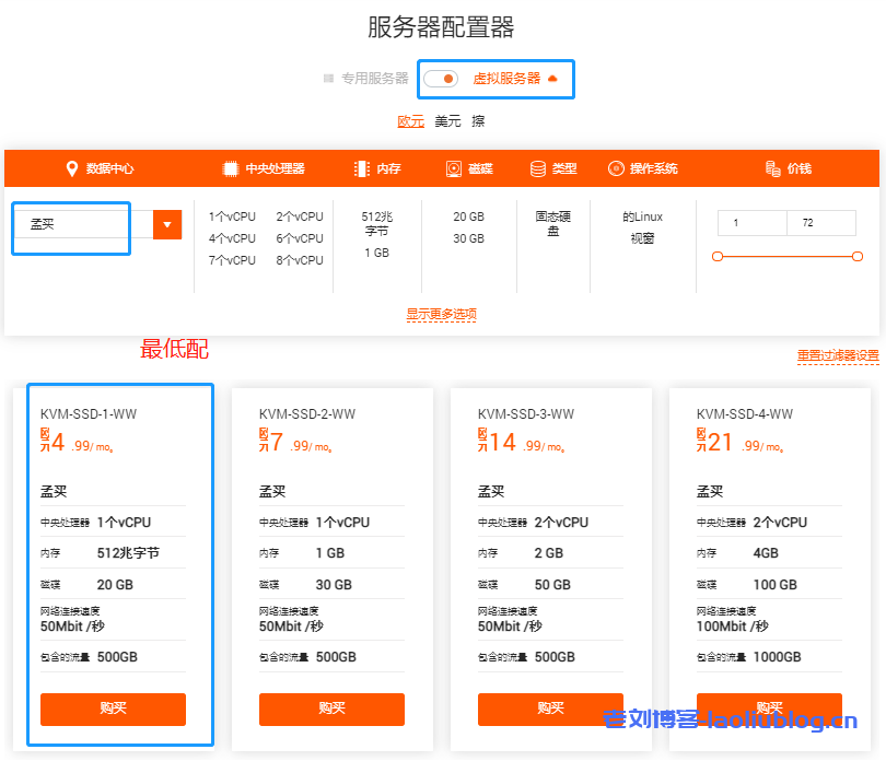 按下图显示,选购最低配印度VPS,中文是谷歌翻译过来的,意思懂即可。购买地址:https://gcorelabs.com/hosting/?from=9705490#/hosting/。