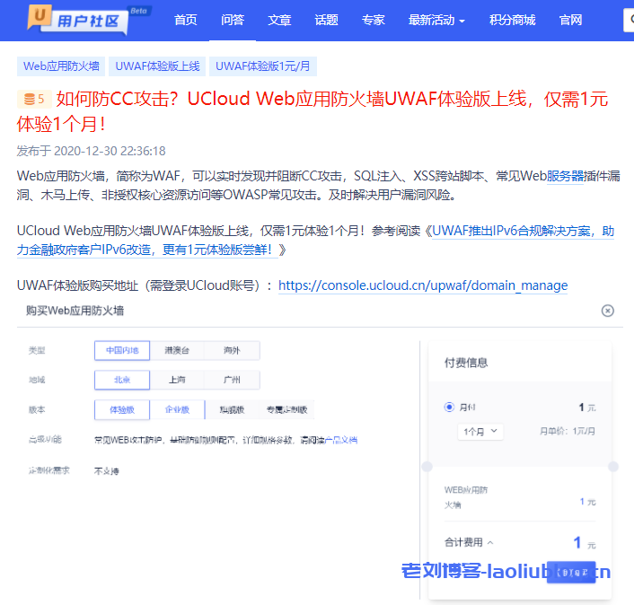 说到云服务商的Web应用防火墙waf的优惠策略,还有一家值得去体验下,那就是ucloud优刻得,之前老刘博客有在他家ucloud用户社区上看到他们最近推出了UWAF体验版,1元享受1个月的WAF安全防护,原文链接https://uclub.ucloud.cn/question/1001.html。大家有兴趣也可以前往了解下。