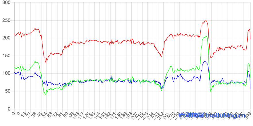 上图是截取了某一行RGB的值做成的曲线图,可以看到,每条曲线都在不停的上下波动,且波动的频率是相同的。有些区域的波动比较小,有些区域突然出现了大幅波动。