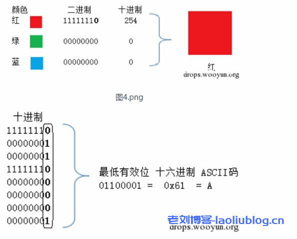 譬如我们想把’A’隐藏进来的话,如下图,就可以把A转成16进制的0x61再转成二进制的01100001,再修改为红色通道的最低位为这些二进制串。