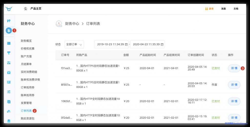 在 管理控制台 页面选择 财务中心 ,选择 订单列表,点击需要查看的资源包「详情」,进入订单详情后,点击「查看用量详情」。
