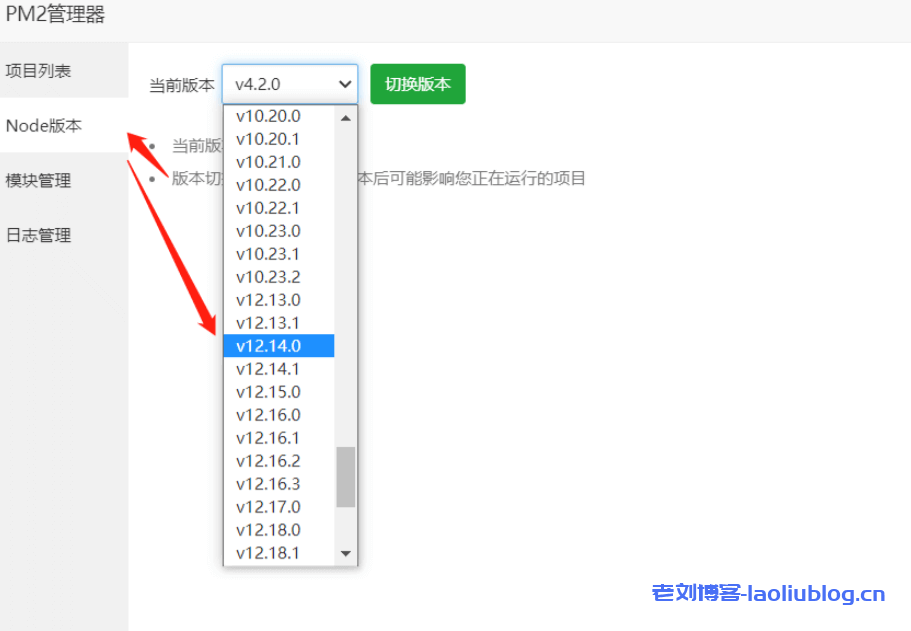 2)进入PM2管理器设置,将node版本改为12.14.0: