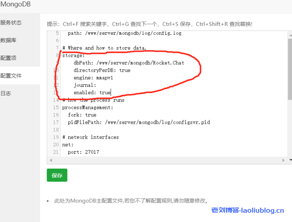 3)进入MongoDB设置,点击配置文件,找到“# Where and how to store data.”,将下面一段代码修改如下: