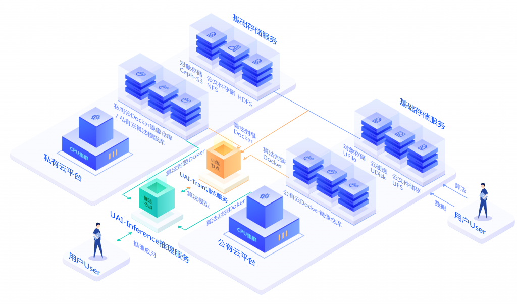 - 2 UAI-Train训练服务基于UCloud GPU计算集群构建,训练节点配置SSD本地存储,后端目前可对接UFile对象存储、UFS文件存储,后续将支持UDisk等多种UCloud存储基础服务;