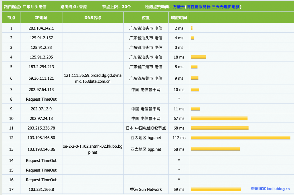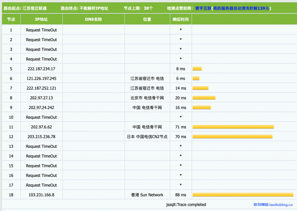 traceroute to 101.95.120.109 (101.95.120.109), 30 hops max, 60 byte packets 1 103.231.166.1 29.17 ms http: json http: json 2 * 3 63.140.7.57 0.99 ms http: error http: 503 4 59.43.247.85 1.36 ms http: json http: json 5 59.43.248.206 28.41 ms http: json http: json 6 59.43.187.77 27.66 ms http: json http: json 7 * 8 59.43.80.102 77.67 ms http: json http: json 9 61.152.24.37 52.02 ms http: 503 http: 503 10 101.95.120.109 52.38 ms http: 503 http: 503 ----------------------------------------------------------------------