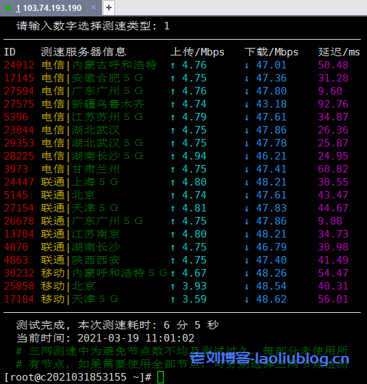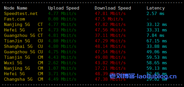 两张图带宽测试测试脚本不同,但结果一致,上传可达5Mbps跑不满,下载接近50Mbps,内地延迟低。