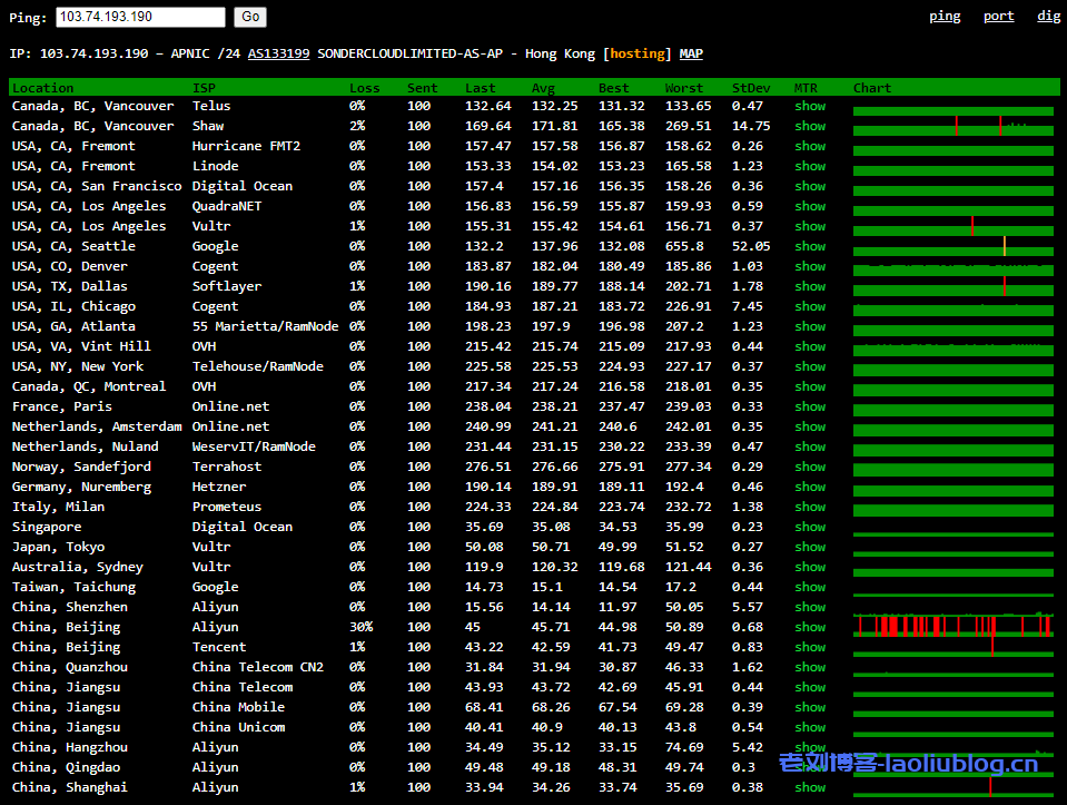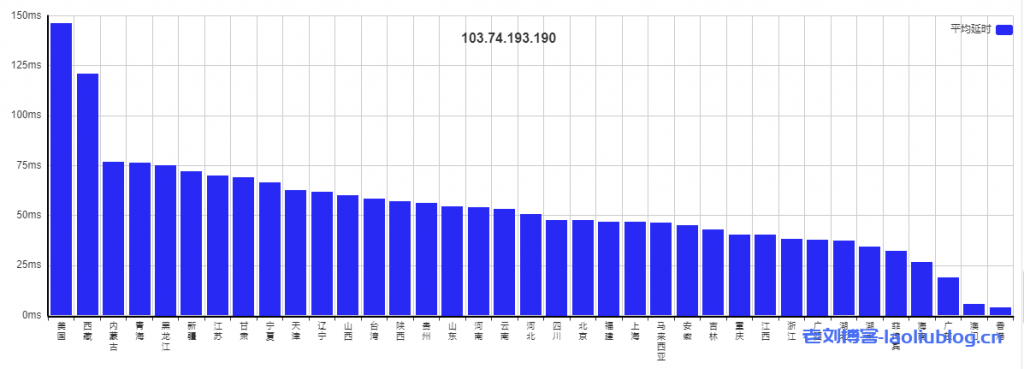 使用17ce.com共测试了147个节点,整体数据如下图,最高美国延迟冶金150ms不到,国内延迟均在75ms以下,本地香港仅3ms。