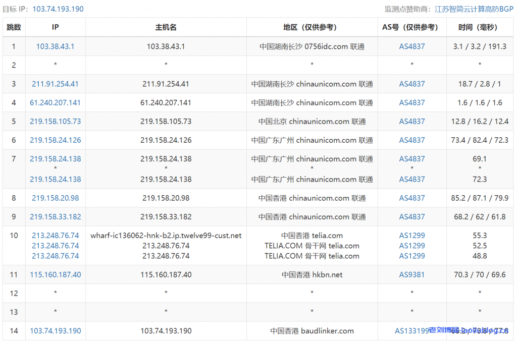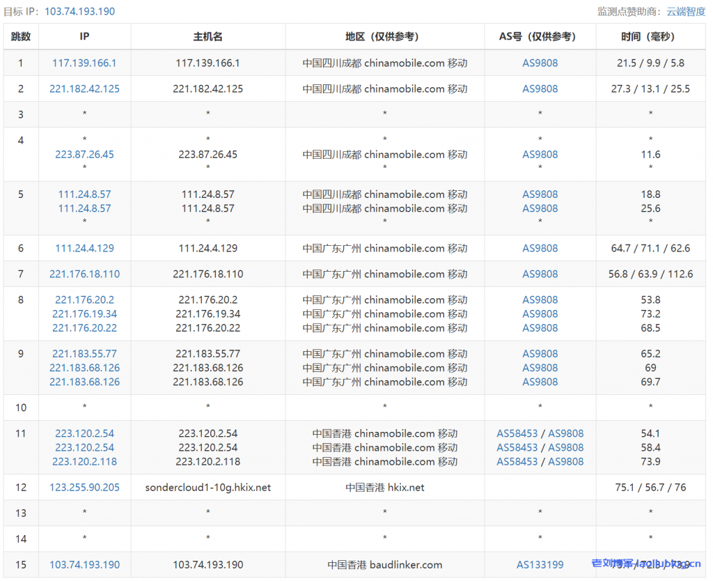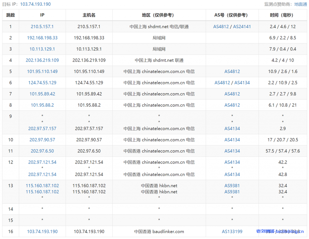 ---------------------------------------------------------------------- 广州电信 traceroute to 14.215.116.1 (14.215.116.1), 30 hops max, 32 byte packets 1 * 2 * 3 * 4 * 5 * 6 * 7 * 8 * 9 * 10 * 11 * 12 * 13 14.215.116.1 18.87 ms AS58466 中国, 广东, 广州, chinatelecom.com.cn, 电信 ---------------------------------------------------------------------- 上海电信 traceroute to 101.95.120.109 (101.95.120.109), 30 hops max, 32 byte packets 1 * 2 * 3 * 4 * 5 * 6 * 7 * 8 * 9 * 10 * 11 101.95.120.109 31.01 ms AS4812 中国, 上海, chinatelecom.com.cn, 电信 ---------------------------------------------------------------------- 厦门电信 traceroute to 117.28.254.129 (117.28.254.129), 30 hops max, 32 byte packets 1 * 2 * 3 * 4 * 5 * 6 * 7 * 8 * 9 * 10 * 11 * 12 * 13 * 14 * 15 * 16 * 17 * 18 117.28.254.129 28.45 ms AS133775 中国, 福建, 厦门, chinatelecom.com.cn, 电信 ---------------------------------------------------------------------- 重庆联通 traceroute to 113.207.25.138 (113.207.25.138), 30 hops max, 32 byte packets 1 * 2 * 3 * 4 * 5 * 6 * 7 * 8 * 9 * 10 * 11 113.207.25.138 68.88 ms AS4837 中国, 重庆, chinaunicom.com, 联通 ---------------------------------------------------------------------- 成都联通 traceroute to 119.6.6.6 (119.6.6.6), 30 hops max, 32 byte packets 1 * 2 * 3 * 4 * 5 * 6 * 7 * 8 * 9 * 10 * 11 * 12 * 13 119.6.6.6 50.23 ms AS4837 中国, 四川, 成都, chinaunicom.com, 联通 ---------------------------------------------------------------------- 上海移动 traceroute to 120.204.197.126 (120.204.197.126), 30 hops max, 32 byte packets 1 * 2 * 3 * 4 * 5 * 6 * 7 * 8 * 9 * 10 * 11 * 12 * 13 * 14 * 15 * 16 * 17 * 18 * 19 120.204.197.126 38.44 ms AS24400 中国, 上海, chinamobile.com, 移动 ---------------------------------------------------------------------- 成都移动 traceroute to 183.221.253.100 (183.221.253.100), 30 hops max, 32 byte packets 1 * 2 * 3 * 4 * 5 * 6 * 7 * 8 * 9 * 10 * 11 * 12 * 13 * 14 * 15 * 16 * 17 * 18 183.221.253.100 51.60 ms AS9808 中国, 四川, 成都, chinamobile.com, 移动 ---------------------------------------------------------------------- 成都教育网 traceroute to 202.112.14.151 (202.112.14.151), 30 hops max, 32 byte packets 1 * 2 * 3 * 4 * 5 * 6 * 7 * 8 * 9 * 10 * 11 * 12 * 13 * 14 * 15 * 16 * 17 * 18 * 19 * 20 * 21 * 22 202.112.14.151 55.10 ms AS24355 中国, 四川, 成都, edu.cn, 教育网 ----------------------------------------------------------------------
