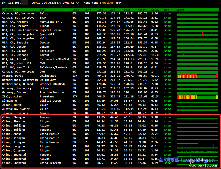 数字表格可能大家看起来不够直观,老刘这里直接上图吧。101个测试节点速度均在100毫秒以内!!