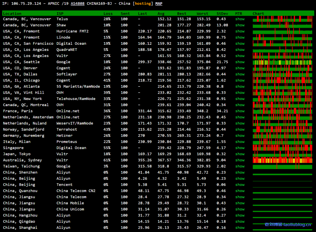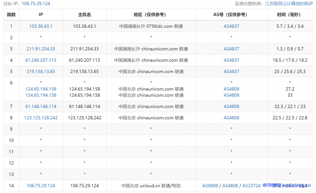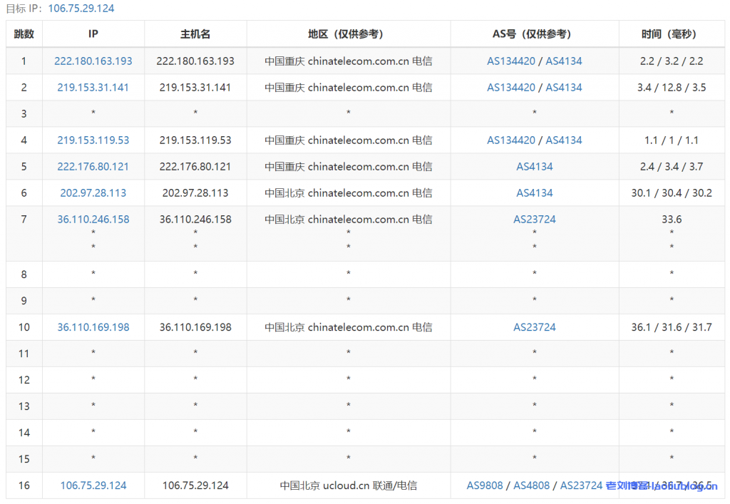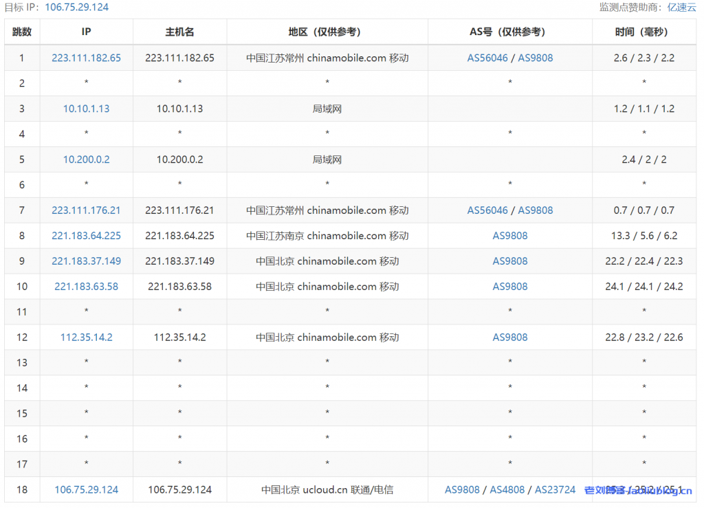 ---------------------------------------------------------------------- 广州电信 traceroute to 14.215.116.1 (14.215.116.1), 30 hops max, 32 byte packets 1 * 2 10.192.10.68 1.00 ms * 局域网 3 10.192.0.135 5.29 ms * 局域网 4 10.192.0.96 1.07 ms * 局域网 5 10.192.1.89 9.73 ms * 局域网 6 * 7 220.181.0.33 3.16 ms AS23724 中国, 北京, chinatelecom.com.cn, 电信 8 36.110.246.145 4.57 ms AS23724 中国, 北京, chinatelecom.com.cn, 电信 9 * 10 113.96.4.78 38.48 ms AS58466 中国, 广东, 广州, chinatelecom.com.cn, 电信 11 113.96.0.5 41.40 ms AS58466 中国, 广东, 广州, chinatelecom.com.cn, 电信 12 183.56.129.10 35.87 ms AS58466 中国, 广东, 广州, chinatelecom.com.cn, 电信 13 14.215.116.1 40.76 ms AS58466 中国, 广东, 广州, chinatelecom.com.cn, 电信 ---------------------------------------------------------------------- 上海电信 traceroute to 101.95.120.109 (101.95.120.109), 30 hops max, 32 byte packets 1 * 2 10.192.74.67 1.37 ms * 局域网 3 * 4 10.192.64.166 1.85 ms * 局域网 5 10.192.65.59 2.96 ms * 局域网 6 * 7 * 8 36.110.248.117 4.89 ms AS23724 中国, 北京, chinatelecom.com.cn, 电信 9 * 10 101.95.88.65 28.07 ms AS4812 中国, 上海, chinatelecom.com.cn, 电信 11 101.95.120.109 27.57 ms AS4812 中国, 上海, chinatelecom.com.cn, 电信 ---------------------------------------------------------------------- 厦门电信 traceroute to 117.28.254.129 (117.28.254.129), 30 hops max, 32 byte packets 1 * 2 10.192.74.67 1.26 ms * 局域网 3 * 4 10.192.64.168 1.77 ms * 局域网 5 10.192.65.63 3.49 ms * 局域网 6 * 7 218.30.28.17 3.86 ms AS23724 中国, 北京, chinatelecom.com.cn, 电信 8 36.110.248.97 6.68 ms AS23724 中国, 北京, chinatelecom.com.cn, 电信 9 202.97.99.61 28.87 ms AS4134 中国, 江苏, 无锡, chinatelecom.com.cn, 电信 10 202.97.2.174 46.21 ms AS4134 中国, 福建, 厦门, chinatelecom.com.cn, 电信 11 27.159.81.138 48.06 ms AS133775 中国, 福建, 厦门, chinatelecom.com.cn, 电信 12 27.159.81.218 52.62 ms AS133775 中国, 福建, 厦门, chinatelecom.com.cn, 电信 13 117.25.141.110 57.01 ms AS133775 中国, 福建, 厦门, chinatelecom.com.cn, 电信 14 117.28.254.129 58.16 ms AS133775 中国, 福建, 厦门, chinatelecom.com.cn, 电信 ---------------------------------------------------------------------- 重庆联通 traceroute to 113.207.25.138 (113.207.25.138), 30 hops max, 32 byte packets 1 * 2 10.192.74.67 1.25 ms * 局域网 3 * 4 10.192.64.168 1.54 ms * 局域网 5 10.192.65.67 2.82 ms * 局域网 6 123.125.128.153 2.14 ms AS4808 中国, 北京, chinaunicom.com, 联通 7 202.106.35.97 4.25 ms AS4808 中国, 北京, chinaunicom.com, 联通 8 202.96.12.181 6.97 ms AS4808 中国, 北京, chinaunicom.com, 联通 9 219.158.12.70 40.35 ms AS4837 中国, 重庆, chinaunicom.com, 联通 10 113.207.25.138 34.95 ms AS4837 中国, 重庆, chinaunicom.com, 联通 ---------------------------------------------------------------------- 成都联通 traceroute to 119.6.6.6 (119.6.6.6), 30 hops max, 32 byte packets 1 * 2 10.192.74.67 0.96 ms * 局域网 3 * 4 10.192.64.56 1.44 ms * 局域网 5 10.192.65.65 2.01 ms * 局域网 6 123.125.128.153 1.72 ms AS4808 中国, 北京, chinaunicom.com, 联通 7 61.148.146.113 1.99 ms AS4808 中国, 北京, chinaunicom.com, 联通 8 61.49.214.33 8.17 ms AS4808 中国, 北京, chinaunicom.com, 联通 9 219.158.98.42 40.48 ms AS4837 中国, 四川, 成都, chinaunicom.com, 联通 10 119.6.197.170 32.94 ms AS4837 中国, 四川, 成都, chinaunicom.com, 联通 11 119.7.220.218 36.14 ms AS4837 中国, 四川, 成都, chinaunicom.com, 联通 12 119.6.6.6 34.16 ms AS4837 中国, 四川, 成都, chinaunicom.com, 联通 ---------------------------------------------------------------------- 上海移动 traceroute to 120.204.197.126 (120.204.197.126), 30 hops max, 32 byte packets 1 * 2 10.192.74.67 0.98 ms * 局域网 3 * 4 10.192.64.168 1.34 ms * 局域网 5 10.192.65.79 3.73 ms * 局域网 6 * 7 112.35.11.193 18.42 ms AS9808 中国, 北京, chinamobile.com, 移动 8 112.35.11.33 2.65 ms AS9808 中国, 北京, chinamobile.com, 移动 9 221.183.63.57 15.96 ms AS9808 中国, 北京, chinamobile.com, 移动 10 221.183.37.134 26.69 ms AS9808 中国, 上海, chinamobile.com, 移动 11 221.183.51.66 26.13 ms AS9808 中国, 上海, chinamobile.com, 移动 12 120.204.194.10 31.62 ms AS24400 中国, 上海, chinamobile.com, 移动 13 120.204.197.126 26.48 ms AS24400 中国, 上海, chinamobile.com, 移动 ---------------------------------------------------------------------- 成都移动 traceroute to 183.221.253.100 (183.221.253.100), 30 hops max, 32 byte packets 1 * 2 10.192.74.67 1.47 ms * 局域网 3 10.192.64.89 4.11 ms * 局域网 4 10.192.64.56 1.70 ms * 局域网 5 10.192.65.77 3.15 ms * 局域网 6 112.35.14.13 31.36 ms AS9808 中国, 北京, chinamobile.com, 移动 7 112.35.11.69 46.61 ms AS9808 中国, 北京, chinamobile.com, 移动 8 112.35.11.33 2.66 ms AS9808 中国, 北京, chinamobile.com, 移动 9 221.183.63.57 3.31 ms AS9808 中国, 北京, chinamobile.com, 移动 10 221.183.37.154 34.85 ms AS9808 中国, 四川, 成都, chinamobile.com, 移动 11 * 12 * 13 183.221.32.30 36.58 ms AS9808 中国, 四川, 成都, chinamobile.com, 移动 14 223.87.85.54 37.16 ms AS9808 中国, 四川, 成都, chinamobile.com, 移动 15 183.221.253.100 36.14 ms AS9808 中国, 四川, 成都, chinamobile.com, 移动 ---------------------------------------------------------------------- 成都教育网 traceroute to 202.112.14.151 (202.112.14.151), 30 hops max, 32 byte packets 1 * 2 10.192.10.68 0.38 ms * 局域网 3 * 4 10.192.0.204 0.77 ms * 局域网 5 10.192.1.99 2.02 ms * 局域网 6 123.125.128.229 1.80 ms AS4808 中国, 北京, chinaunicom.com, 联通 7 202.106.35.97 2.62 ms AS4808 中国, 北京, chinaunicom.com, 联通 8 console.bta.net.cn (202.96.12.117) 6.26 ms AS4808 中国, 北京, chinaunicom.com, 联通 9 219.158.5.130 3.36 ms AS4837 中国, 北京, chinaunicom.com, 联通 10 219.158
