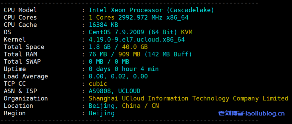 快杰S型云服务器好用吗?由于经常推荐UCloud的云产品,不少朋友来问我这个问题,这里购买了UCloud一台北京可用区快杰S型OS最低配置BGP线路云服务器:1核1G内存1M带宽进行性能评测。由于商家默认40G以内系统盘不收费,老刘博客这里把系统盘加到了40G,以下是控制台主机配置信息。