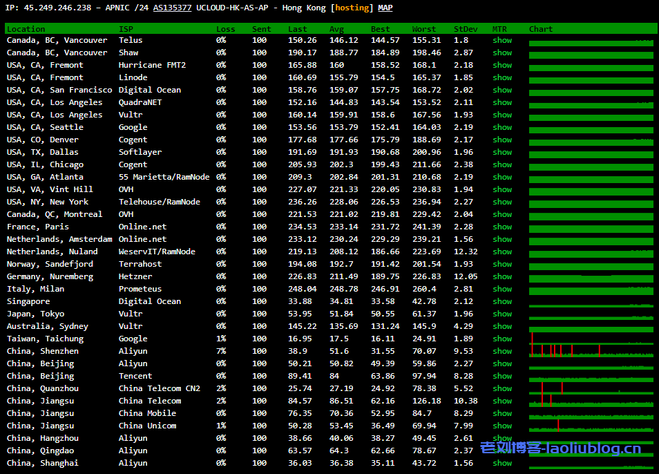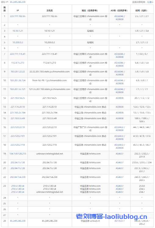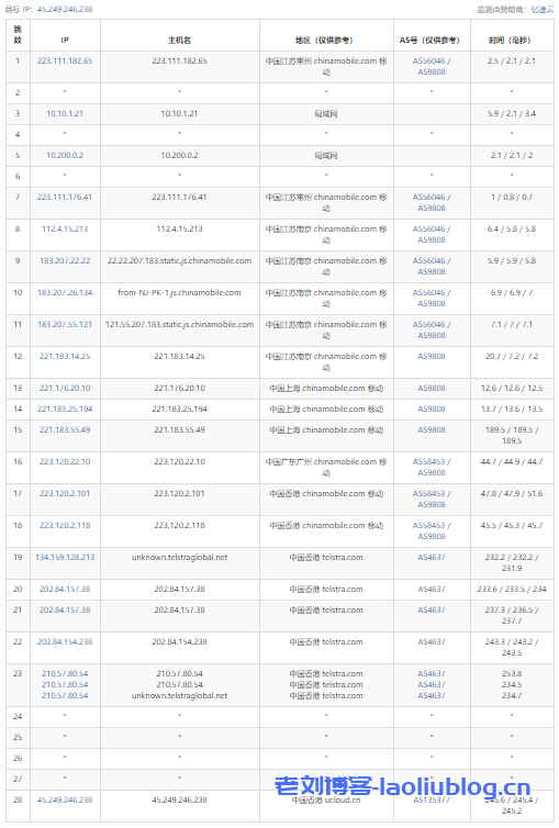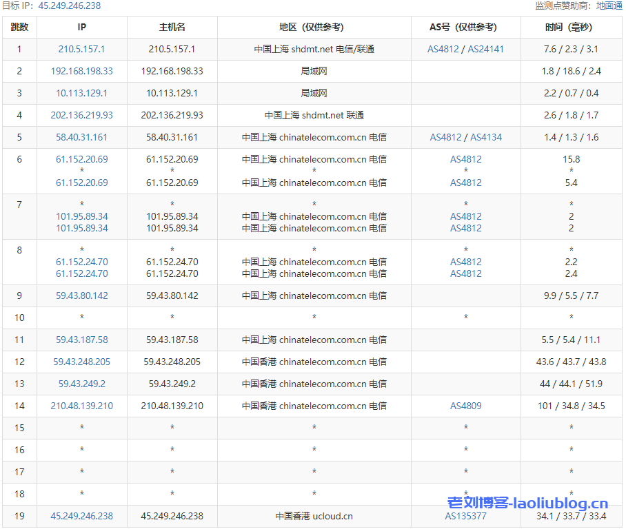 ---------------------------------------------------------------------- 广州电信 traceroute to 14.215.116.1 (14.215.116.1), 30 hops max, 32 byte packets 1 * 2 172.31.161.145 0.59 ms * LAN Address 3 172.31.160.217 1.09 ms * LAN Address 4 172.31.160.193 1.32 ms * LAN Address 5 210.48.139.209 3.63 ms AS4809 China, Hong Kong, ChinaTelecom 6 59.43.248.5 4.27 ms * China, ChinaTelecom 7 59.43.248.201 10.18 ms * China, ChinaTelecom 8 * 9 59.43.130.125 11.29 ms * China, ChinaTelecom 10 59.43.80.122 11.16 ms * China, ChinaTelecom 11 113.108.208.26 14.87 ms AS58466 China, Guangdong, Guangzhou, ChinaTelecom 12 121.14.50.226 12.65 ms AS58466 China, Guangdong, Guangzhou, ChinaTelecom 13 183.56.129.10 11.99 ms AS58466 China, Guangdong, Guangzhou, ChinaTelecom 14 14.215.116.1 12.90 ms AS58466 China, Guangdong, Guangzhou, ChinaTelecom ---------------------------------------------------------------------- 上海电信 traceroute to 101.95.120.109 (101.95.120.109), 30 hops max, 32 byte packets 1 * 2 172.31.161.145 0.43 ms * LAN Address 3 172.31.160.217 0.64 ms * LAN Address 4 172.31.160.193 1.22 ms * LAN Address 5 210.48.139.209 3.20 ms AS4809 China, Hong Kong, ChinaTelecom 6 59.43.248.121 3.48 ms * China, ChinaTelecom 7 59.43.183.81 30.02 ms * China, ChinaTelecom 8 59.43.187.85 32.87 ms * China, ChinaTelecom 9 * 10 59.43.80.78 38.60 ms * China, ChinaTelecom 11 101.95.120.161 37.82 ms AS4812 China, Shanghai, ChinaTelecom 12 101.95.120.109 29.58 ms AS4812 China, Shanghai, ChinaTelecom ---------------------------------------------------------------------- 厦门电信 traceroute to 117.28.254.129 (117.28.254.129), 30 hops max, 32 byte packets 1 * 2 172.31.161.145 0.36 ms * LAN Address 3 * 4 172.31.160.193 0.83 ms * LAN Address 5 172.31.163.66 0.82 ms * LAN Address 6 43.252.86.209 0.88 ms AS10099 China, Hong Kong, ChinaUnicom 7 202.77.18.161 2.68 ms AS10099 China, Hong Kong, ChinaUnicom 8 202.77.18.101 2.80 ms AS10099 China, Hong Kong, ChinaUnicom 9 61.14.201.73 3.92 ms * China, Hong Kong, ChinaUnicom 10 43.252.86.65 6.18 ms AS10099 China, Hong Kong, ChinaUnicom 11 43.252.86.129 4.25 ms AS10099 China, Hong Kong, ChinaUnicom 12 219.158.10.49 11.54 ms AS4837 China, ChinaUnicom 13 219.158.20.221 10.13 ms AS4837 China, ChinaUnicom 14 219.158.24.125 46.80 ms AS4837 China, ChinaUnicom 15 219.158.22.174 53.59 ms AS4837 China, ChinaUnicom 16 219.158.12.46 75.19 ms AS4837 China, ChinaUnicom 17 * 18 * 19 110.80.128.130 76.07 ms AS133775 China, Fujian, Xiamen, ChinaTelecom 20 27.159.81.202 91.50 ms AS133775 China, Fujian, Xiamen, ChinaTelecom 21 117.25.141.110 96.86 ms AS133775 China, Fujian, Xiamen, ChinaTelecom 22 117.28.254.129 75.85 ms AS133775 China, Fujian, Xiamen, ChinaTelecom ---------------------------------------------------------------------- 重庆联通 traceroute to 113.207.25.138 (113.207.25.138), 30 hops max, 32 byte packets 1 * 2 172.31.165.147 0.40 ms * LAN Address 3 172.31.164.217 0.65 ms * LAN Address 4 172.31.164.193 0.88 ms * LAN Address 5 43.252.86.209 0.98 ms AS10099 China, Hong Kong, ChinaUnicom 6 202.77.18.161 3.37 ms AS10099 China, Hong Kong, ChinaUnicom 7 202.77.18.101 3.03 ms AS10099 China, Hong Kong, ChinaUnicom 8 61.14.201.73 3.51 ms * China, Hong Kong, ChinaUnicom 9 43.252.86.65 2.06 ms AS10099 China, Hong Kong, ChinaUnicom 10 43.252.86.66 7.20 ms AS10099 China, Hong Kong, ChinaUnicom 11 43.252.86.141 2.04 ms AS10099 China, Hong Kong, ChinaUnicom 12 219.158.10.61 8.19 ms AS4837 China, ChinaUnicom 13 219.158.98.93 11.39 ms AS4837 China, ChinaUnicom 14 219.158.8.113 43.33 ms AS4837 China, ChinaUnicom 15 219.158.99.210 63.84 ms AS4837 China, ChinaUnicom 16 113.207.25.138 54.55 ms AS4837 China, Chongqing, ChinaUnicom ---------------------------------------------------------------------- 成都联通 traceroute to 119.6.6.6 (119.6.6.6), 30 hops max, 32 byte packets 1 * 2 172.31.161.145 0.38 ms * LAN Address 3 172.31.160.217 0.54 ms * LAN Address 4 172.31.160.193 0.75 ms * LAN Address 5 172.31.163.66 0.90 ms * LAN Address 6 43.252.86.209 1.13 ms AS10099 China, Hong Kong, ChinaUnicom 7 202.77.18.161 3.60 ms AS10099 China, Hong Kong, ChinaUnicom 8 202.77.18.101 3.76 ms AS10099 China, Hong Kong, ChinaUnicom 9 61.14.201.73 7.42 ms * China, Hong Kong, ChinaUnicom 10 43.252.86.65 5.84 ms AS10099 China, Hong Kong, ChinaUnicom 11 202.77.23.25 4.11 ms AS10099 China, Hong Kong, ChinaUnicom 12 219.158.10.53 5.92 ms AS4837 China, ChinaUnicom 13 219.158.96.206 13.36 ms AS4837 China, ChinaUnicom 14 219.158.103.41 52.62 ms AS4837 China, ChinaUnicom 15 219.158.102.186 74.10 ms AS4837 China, ChinaUnicom 16 * 17 119.7.220.218 98.95 ms AS4837 China, Sichuan, Chengdu, ChinaUnicom 18 119.6.6.6 81.80 ms AS4837 China, Sichuan, Chengdu, ChinaUnicom ---------------------------------------------------------------------- 上海移动 traceroute to 120.204.197.126 (120.204.197.126), 30 hops max, 32 byte packets 1 * 2 172.31.161.145 0.43 ms * LAN Address 3 172.31.160.217 0.70 ms * LAN Address 4 172.31.160.193 0.95 ms * LAN Address 5 172.31.163.66 0.88 ms * LAN Address 6 43.252.86.209 0.98 ms AS10099 China, Hong Kong, ChinaUnicom 7 202.77.18.161 3.05 ms AS10099 China, Hong Kong, ChinaUnicom 8 202.77.18.98 4.05 ms AS10099 China, Hong Kong, ChinaUnicom 9 61.14.201.73 2.23 ms * China, Hong Kong, ChinaUnicom 10 43.252.86.65 8.95 ms AS10099 China, Hong Kong, ChinaUnicom 11 43.252.86.129 1.93 ms AS10099 China, Hong Kong, ChinaUnicom 12 219.158.10.53 9.09 ms AS4837 China, ChinaUnicom 13 219.158.97.30 10.89 ms AS4837 China, ChinaUnicom 14 219.158.97.1 45.68 ms AS4837 China, ChinaUnicom 15 219.158.7.41 64.67 ms AS4837 China, ChinaUnicom 16 * 17 219.158.45.170 81.50 ms AS4837 China, ChinaUnicom 18 221.176.17.165 75.08 ms AS9808 China, ChinaMobile 19 221.183.62.210 71.76 ms AS9808 China, ChinaMobile 20 117.143.13.66 86.13 ms AS24400 China, Shanghai, ChinaMobile 21 120.204.194.14 88.18 ms AS24400 China, Shanghai, ChinaMobile 22 120.204.197.126 73.01 ms AS24400 China, Shanghai, ChinaMobile --------------------------------------------