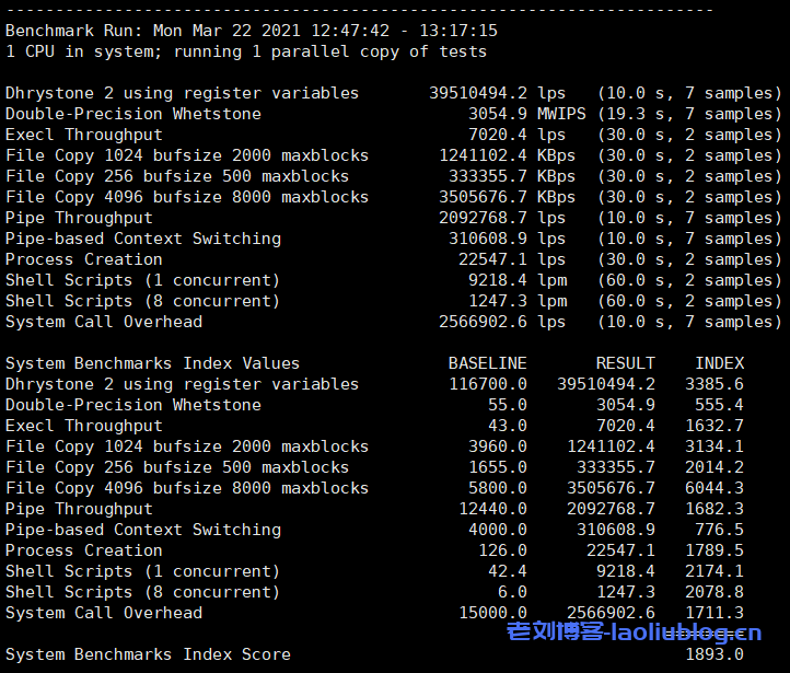 UnixBench跑分结果为1893.0 > 1000,综合性能优异!