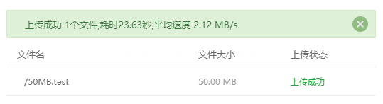 使用50MB的测速文件测试,平均上传速度2.12MB/s,文件下载速度100+KB/s(1M带宽下载速度理论值是125KB/s)。
