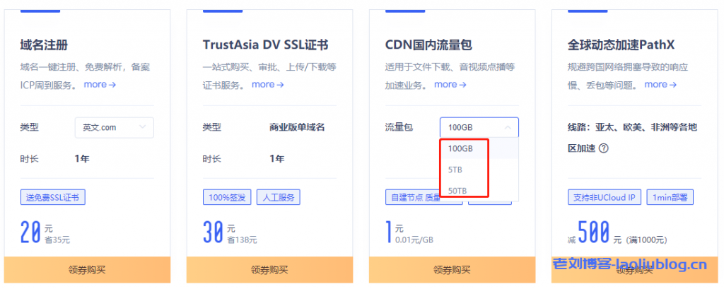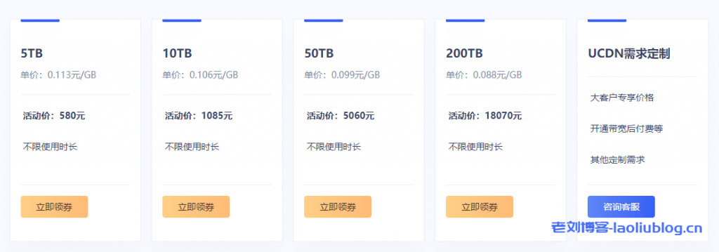 去UCloud全球大促活动页面必备云产品普惠专题(https://www.ucloud.cn/site/active/kuaijie.html#products)领券,这里有100GB/5TB/50TB三种规格的CDN国内流量包代金券,其中1元/100GB、580元/5TB和5060元/50TB。由于只能任选其一,老刘博客建议首次先领1元/100GB的券,先试试水,看看他家产品喜不喜欢。