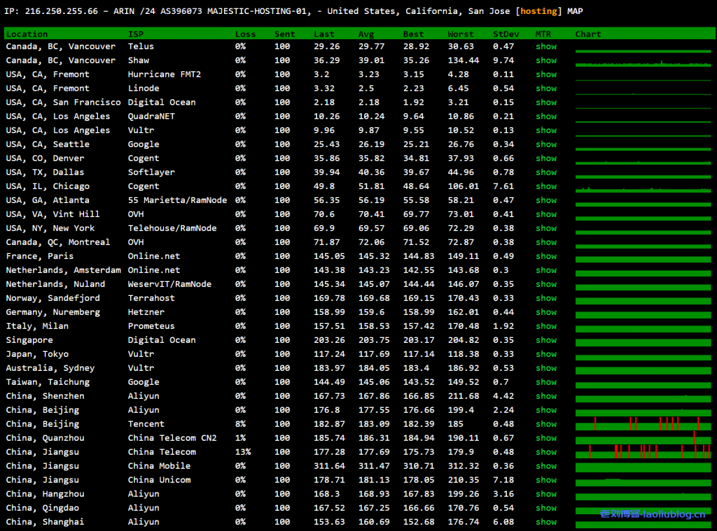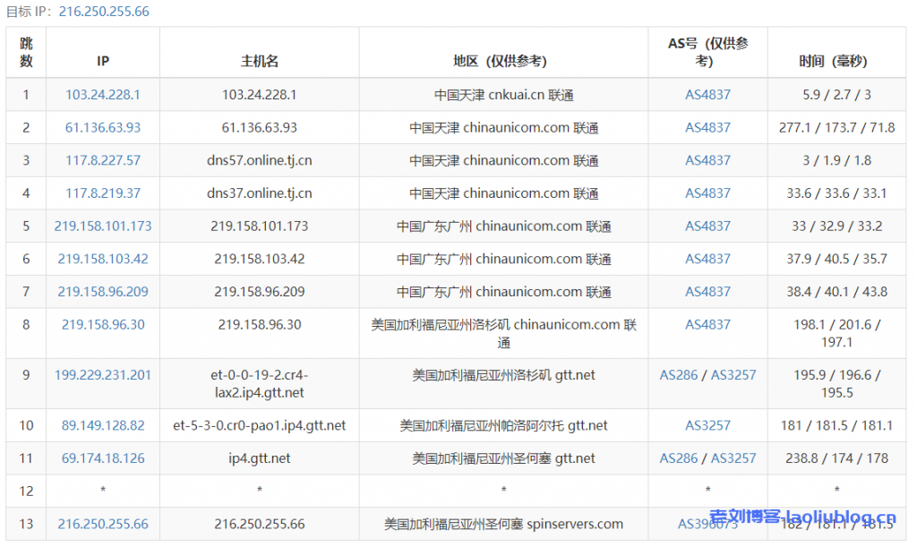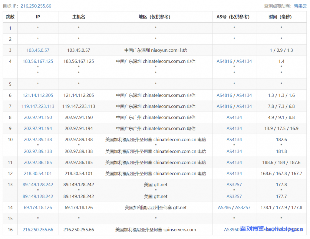 ---------------------------------------------------------------------- 广州电信 traceroute to 14.215.116.1 (14.215.116.1), 30 hops max, 32 byte packets 1 216.250.254.3 0.24 ms AS396073 United States, California, San Jose, spinservers.com 2 169.254.0.107 0.26 ms * The Local Link 3 169.254.65.1 0.58 ms * The Local Link 4 ae25-302.cr0-pao1.ip4.gtt.net (69.174.18.125) 2.52 ms AS286,AS3257 United States, California, Palo Alto, gtt.net 5 ae6.cr6-sjc1.ip4.gtt.net (89.149.180.78) 1.83 ms AS3257 United States, California, San Jose, gtt.net 6 218.30.54.100 5.80 ms AS4134 United States, California, Los Angeles, ChinaTelecom 7 202.97.86.186 2.95 ms AS4134 China, ChinaTelecom 8 202.97.89.137 173.50 ms AS4134 China, ChinaTelecom 9 202.97.12.30 174.04 ms AS4134 China, ChinaTelecom 10 202.97.94.145 183.35 ms AS4134 China, ChinaTelecom 11 113.96.4.146 184.82 ms AS58466 China, Guangdong, Guangzhou, ChinaTelecom 12 183.2.167.249 177.11 ms AS58466 China, Guangdong, Guangzhou, ChinaTelecom 13 183.56.129.2 193.98 ms AS58466 China, Guangdong, Guangzhou, ChinaTelecom 14 14.215.116.1 177.22 ms AS58466 China, Guangdong, Guangzhou, ChinaTelecom ---------------------------------------------------------------------- 上海电信 traceroute to 101.95.120.109 (101.95.120.109), 30 hops max, 32 byte packets 1 216.250.254.3 0.43 ms AS396073 United States, California, San Jose, spinservers.com 2 169.254.0.107 0.50 ms * The Local Link 3 169.254.65.1 0.41 ms * The Local Link 4 ae25-302.cr0-pao1.ip4.gtt.net (69.174.18.125) 0.99 ms AS286,AS3257 United States, California, Palo Alto, gtt.net 5 ae6.cr6-sjc1.ip4.gtt.net (89.149.180.78) 1.97 ms AS3257 United States, California, San Jose, gtt.net 6 218.30.54.100 4.63 ms AS4134 United States, California, Los Angeles, ChinaTelecom 7 202.97.86.178 6.60 ms AS4134 China, ChinaTelecom 8 202.97.51.205 140.64 ms AS4134 China, ChinaTelecom 9 202.97.12.193 141.77 ms AS4134 China, ChinaTelecom 10 202.97.50.165 151.43 ms AS4134 China, ChinaTelecom 11 61.152.24.29 146.60 ms AS4812 China, Shanghai, ChinaTelecom 12 101.95.120.109 151.68 ms AS4812 China, Shanghai, ChinaTelecom ---------------------------------------------------------------------- 厦门电信 traceroute to 117.28.254.129 (117.28.254.129), 30 hops max, 32 byte packets 1 216.250.254.3 0.26 ms AS396073 United States, California, San Jose, spinservers.com 2 169.254.0.107 0.52 ms * The Local Link 3 169.254.65.1 0.46 ms * The Local Link 4 ae25-302.cr0-pao1.ip4.gtt.net (69.174.18.125) 6.59 ms AS286,AS3257 United States, California, Palo Alto, gtt.net 5 as1299.pao10.ip4.gtt.net (173.205.54.170) 1.11 ms AS286,AS3257 United States, California, Palo Alto, gtt.net 6 palo-b24-link.ip.twelve99.net (62.115.122.168) 1.69 ms AS1299 United States, California, Palo Alto, telia.com 7 chinatelecom-ic307264-sjo-b21.ip.twelve99-cust.net (80.239.132.158) 3.80 ms AS1299 United States, California, San Jose, telia.com 8 59.43.181.153 182.66 ms * China, ChinaTelecom 9 59.43.187.73 197.11 ms * China, ChinaTelecom 10 59.43.138.57 184.18 ms * China, ChinaTelecom 11 59.43.98.26 193.59 ms * China, ChinaTelecom 12 59.43.139.90 186.66 ms * China, ChinaTelecom 13 27.159.81.246 156.52 ms AS133775 China, Fujian, Xiamen, ChinaTelecom 14 27.159.81.202 162.93 ms AS133775 China, Fujian, Xiamen, ChinaTelecom 15 117.25.141.110 188.48 ms AS133775 China, Fujian, Xiamen, ChinaTelecom 16 117.28.254.129 188.37 ms AS133775 China, Fujian, Xiamen, ChinaTelecom ---------------------------------------------------------------------- 重庆联通 traceroute to 113.207.25.138 (113.207.25.138), 30 hops max, 32 byte packets 1 216.250.254.3 0.35 ms AS396073 United States, California, San Jose, spinservers.com 2 169.254.0.107 0.50 ms * The Local Link 3 169.254.65.1 0.49 ms * The Local Link 4 ae25-302.cr0-pao1.ip4.gtt.net (69.174.18.125) 1.03 ms AS286,AS3257 United States, California, Palo Alto, gtt.net 5 ae3.cr5-sjc1.ip4.gtt.net (89.149.180.38) 1.68 ms AS3257 United States, California, San Jose, gtt.net 6 as4837.sjc10.ip4.gtt.net (173.205.62.86) 4.96 ms AS286,AS3257 United States, California, San Jose, gtt.net 7 219.158.102.109 159.69 ms AS4837 China, ChinaUnicom 8 219.158.19.74 158.30 ms AS4837 China, ChinaUnicom 9 219.158.19.81 165.16 ms AS4837 China, ChinaUnicom 10 219.158.106.254 176.49 ms AS4837 China, ChinaUnicom 11 113.207.25.138 174.77 ms AS4837 China, Chongqing, ChinaUnicom ---------------------------------------------------------------------- 成都联通 traceroute to 119.6.6.6 (119.6.6.6), 30 hops max, 32 byte packets 1 216.250.254.3 0.55 ms AS396073 United States, California, San Jose, spinservers.com 2 169.254.0.107 0.53 ms * The Local Link 3 169.254.65.1 0.30 ms * The Local Link 4 ae25-302.cr0-pao1.ip4.gtt.net (69.174.18.125) 1.04 ms AS286,AS3257 United States, California, Palo Alto, gtt.net 5 ae2.cr5-sjc1.ip4.gtt.net (89.149.180.26) 2.26 ms AS3257 United States, California, San Jose, gtt.net 6 as4837.sjc10.ip4.gtt.net (173.205.62.82) 3.92 ms AS286,AS3257 United States, California, San Jose, gtt.net 7 219.158.102.113 160.55 ms AS4837 China, ChinaUnicom 8 219.158.19.86 155.97 ms AS4837 China, ChinaUnicom 9 219.158.19.69 169.77 ms AS4837 China, ChinaUnicom 10 219.158.107.90 184.35 ms AS4837 China, ChinaUnicom 11 119.6.197.194 178.10 ms AS4837 China, Sichuan, Chengdu, ChinaUnicom 12 119.7.220.218 183.42 ms AS4837 China, Sichuan, Chengdu, ChinaUnicom 13 119.6.6.6 181.48 ms AS4837 China, Sichuan, Chengdu, ChinaUnicom ---------------------------------------------------------------------- 上海移动 traceroute to 120.204.197.126 (120.204.197.126), 30 hops max, 32 byte packets 1 216.250.254.3 0.31 ms AS396073 United States, California, San Jose, spinservers.com 2 169.254.0.107 0.50 ms * The Local Link 3 169.254.65.1 0.42 ms * The Local Link 4 ae25-302.cr0-pao1.ip4.gtt.net (69.174.18.125) 1.06 ms AS286,AS3257 United States, California, Palo Alto, gtt.net 5 as1299.pao10.ip4.gtt.net (173.205.54.170) 2.84 ms AS286,AS3257 United States, California, Palo Alto, gtt.net 6 palo-b24-link