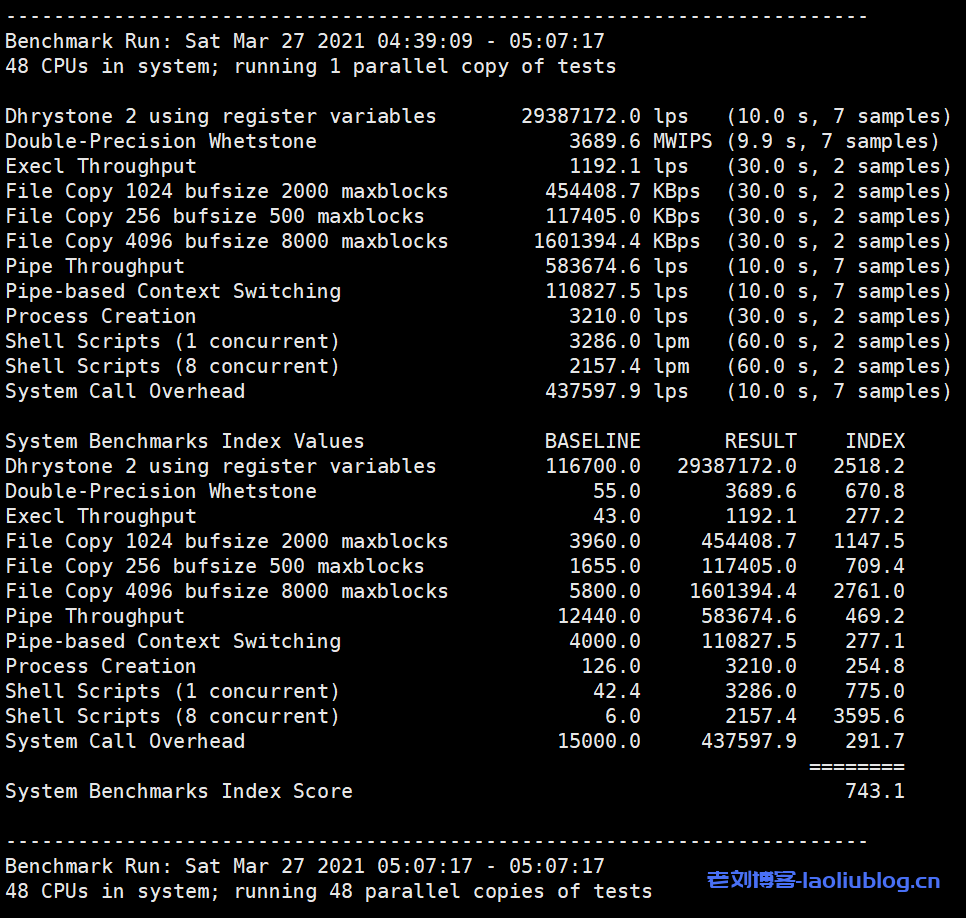 UnixBench跑分可以看出云服务器综合性能。得分小于400的性能比较差、500-1000正常、大于1000优秀、大于2000极好。当然跑分不是认定机器好坏的唯一标准,需要综合考虑。这里跑分743.1,属于正常水平。