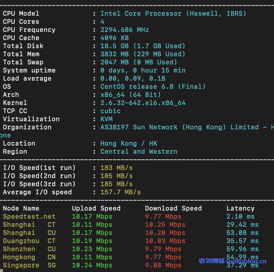 老刘博客找41云官方开了台香港CN2 3区大带宽VPS,测评结果如下: