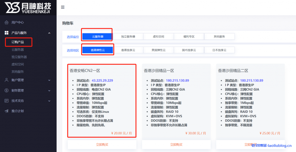 注册登录后,进入用户中心,选择产品与服务中心-订购产品-云服务器-香港弹性云-香港安畅CN2一区,之后选择立即购买即可,购买图示: