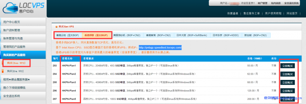 如何购买?注册登录账号,进入客户中心,选择购买[Xen VPS],选择香港云地(亚太BGP)或香港邦联(亚太BGP),之后选购自己想要的配置套餐即可。