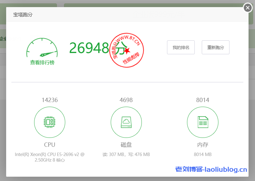 宝塔跑分26948,性能彪悍,机器配置信息与脚本测试结果一致。