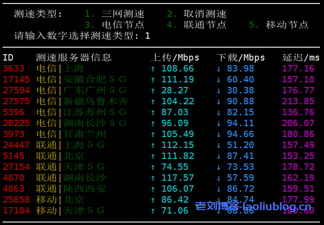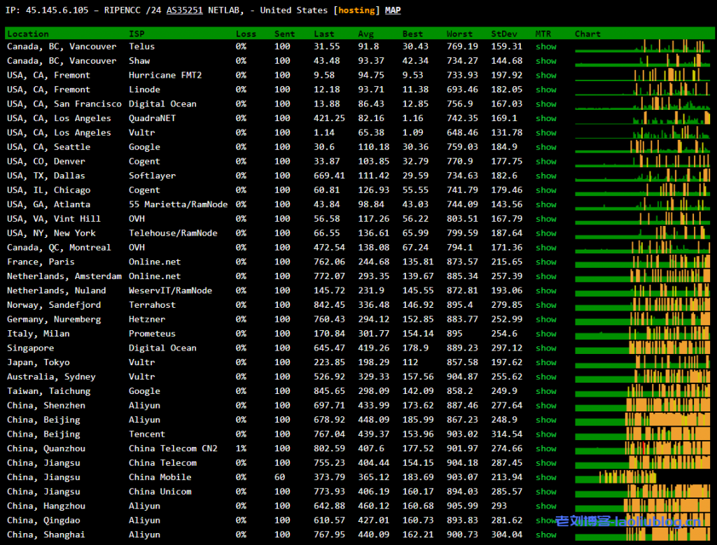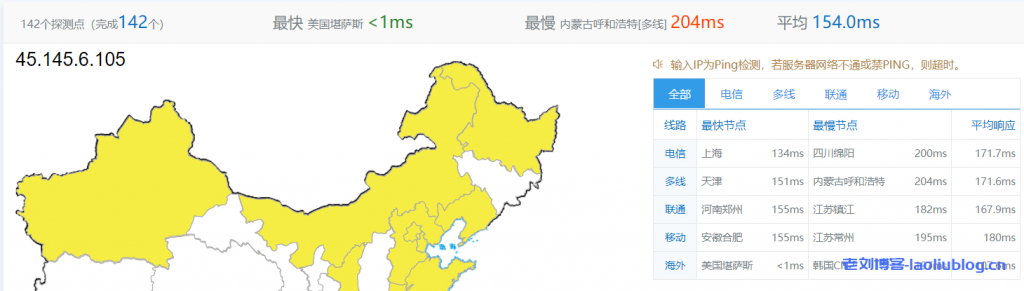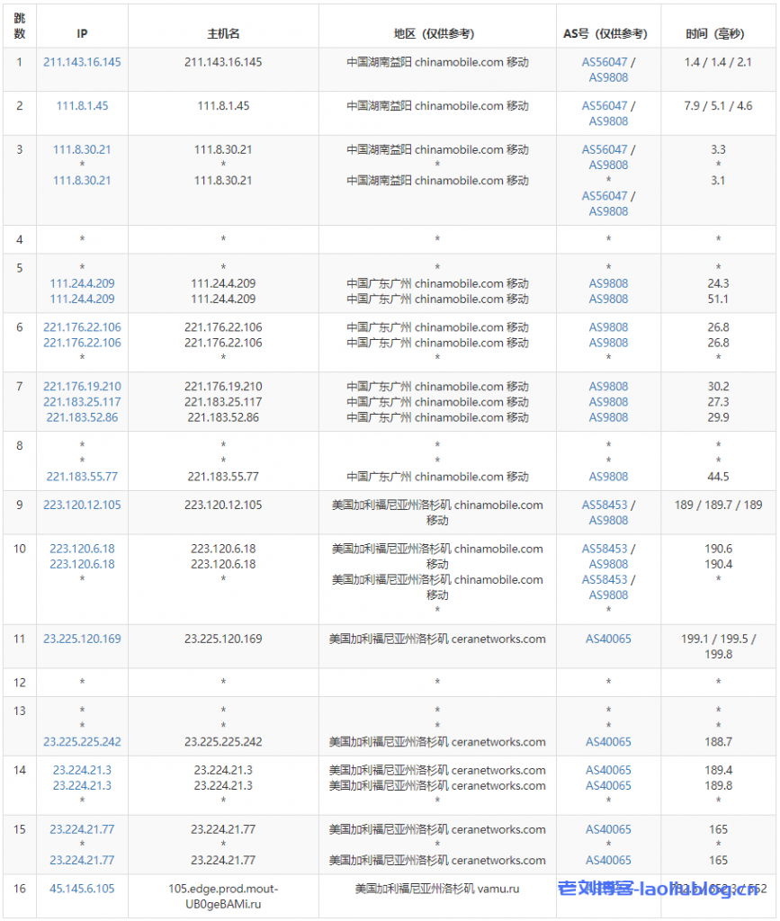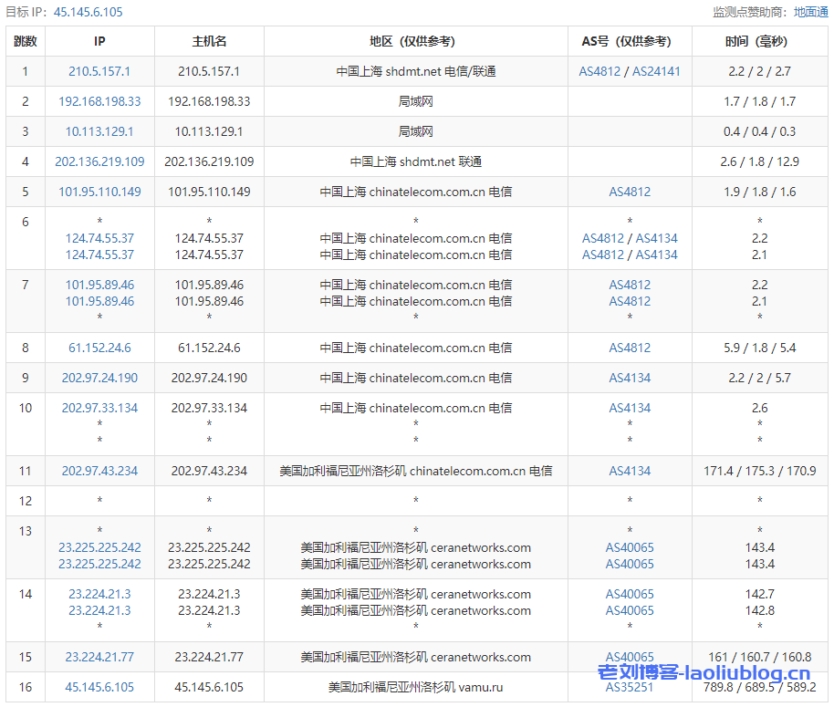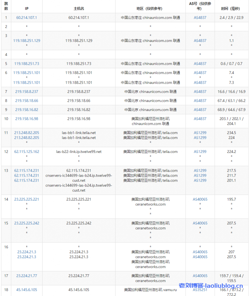 ---------------------------------------------------------------------- 广州电信 traceroute to 14.215.116.1 (14.215.116.1), 30 hops max, 32 byte packets 1 23.224.49.126 1.32 ms AS40065 美国, 加利福尼亚州, 洛杉矶, ceranetworks.com 2 23.224.21.76 0.65 ms AS40065 美国, 加利福尼亚州, 洛杉矶, ceranetworks.com 3 192.168.101.201 0.61 ms * 局域网 4 192.168.101.62 1.74 ms * 局域网 5 * 6 23.225.225.65 156.85 ms AS40065 美国, 加利福尼亚州, 洛杉矶, ceranetworks.com 7 219.158.116.237 163.56 ms AS4837 中国, 上海, chinaunicom.com, 联通 8 219.158.113.138 163.49 ms AS4837 中国, 上海, chinaunicom.com, 联通 9 219.158.113.101 158.32 ms AS4837 中国, 上海, chinaunicom.com, 联通 10 * 11 * 12 202.97.16.13 169.79 ms AS4134 中国, 广东, 广州, chinatelecom.com.cn, 电信 13 * 14 * 15 183.2.145.198 169.28 ms AS58466 中国, 广东, 广州, chinatelecom.com.cn, 电信 16 183.56.129.10 162.77 ms AS58466 中国, 广东, 广州, chinatelecom.com.cn, 电信 17 14.215.116.1 168.16 ms AS58466 中国, 广东, 广州, chinatelecom.com.cn, 电信 ---------------------------------------------------------------------- 上海电信 traceroute to 101.95.120.109 (101.95.120.109), 30 hops max, 32 byte packets 1 23.224.49.126 1.48 ms AS40065 美国, 加利福尼亚州, 洛杉矶, ceranetworks.com 2 23.224.21.76 0.49 ms AS40065 美国, 加利福尼亚州, 洛杉矶, ceranetworks.com 3 * 4 192.168.101.62 0.64 ms * 局域网 5 * 6 23.225.225.65 153.09 ms AS40065 美国, 加利福尼亚州, 洛杉矶, ceranetworks.com 7 219.158.102.129 161.24 ms AS4837 中国, 上海, chinaunicom.com, 联通 8 219.158.113.142 159.57 ms AS4837 中国, 上海, chinaunicom.com, 联通 9 219.158.113.105 160.96 ms AS4837 中国, 上海, chinaunicom.com, 联通 10 * 11 202.97.17.193 143.78 ms AS4134 中国, 上海, chinatelecom.com.cn, 电信 12 202.97.87.157 141.89 ms AS4134 中国, 上海, chinatelecom.com.cn, 电信 13 101.95.120.109 140.71 ms AS4812 中国, 上海, chinatelecom.com.cn, 电信 ---------------------------------------------------------------------- 厦门电信 traceroute to 117.28.254.129 (117.28.254.129), 30 hops max, 32 byte packets 1 23.224.49.126 1.44 ms AS40065 美国, 加利福尼亚州, 洛杉矶, ceranetworks.com 2 23.224.21.76 0.51 ms AS40065 美国, 加利福尼亚州, 洛杉矶, ceranetworks.com 3 192.168.101.201 0.44 ms * 局域网 4 192.168.101.62 0.60 ms * 局域网 5 * 6 23.225.225.65 156.93 ms AS40065 美国, 加利福尼亚州, 洛杉矶, ceranetworks.com 7 219.158.116.233 189.58 ms AS4837 中国, 上海, chinaunicom.com, 联通 8 219.158.113.122 183.31 ms AS4837 中国, 上海, chinaunicom.com, 联通 9 219.158.113.113 180.24 ms AS4837 中国, 上海, chinaunicom.com, 联通 10 * 11 219.158.40.174 171.10 ms AS4837 中国, 上海, chinaunicom.com, 联通 12 59.43.17.202 201.23 ms * 中国, 福建, 福州, chinatelecom.com.cn, 电信 13 59.43.139.90 194.86 ms * 中国, chinatelecom.com.cn, 电信 14 27.159.81.246 191.25 ms AS133775 中国, 福建, 厦门, chinatelecom.com.cn, 电信 15 27.159.81.198 184.79 ms AS133775 中国, 福建, 厦门, chinatelecom.com.cn, 电信 16 117.25.141.106 201.25 ms AS133775 中国, 福建, 厦门, chinatelecom.com.cn, 电信 17 117.28.254.129 196.37 ms AS4809 中国, 福建, 厦门, chinatelecom.com.cn, 电信 ---------------------------------------------------------------------- 重庆联通 traceroute to 113.207.25.138 (113.207.25.138), 30 hops max, 32 byte packets 1 23.224.49.126 1.92 ms AS40065 美国, 加利福尼亚州, 洛杉矶, ceranetworks.com 2 23.224.21.76 0.41 ms AS40065 美国, 加利福尼亚州, 洛杉矶, ceranetworks.com 3 * 4 192.168.101.62 1.06 ms * 局域网 5 * 6 23.225.225.65 151.49 ms AS40065 美国, 加利福尼亚州, 洛杉矶, ceranetworks.com 7 219.158.98.173 152.92 ms AS4837 中国, 上海, chinaunicom.com, 联通 8 219.158.19.90 157.46 ms AS4837 中国, 上海, chinaunicom.com, 联通 9 219.158.19.81 151.37 ms AS4837 中国, 上海, chinaunicom.com, 联通 10 219.158.106.254 175.84 ms AS4837 中国, 重庆, chinaunicom.com, 联通 11 113.207.25.138 175.68 ms AS4837 中国, 重庆, chinaunicom.com, 联通 ---------------------------------------------------------------------- 成都联通 traceroute to 119.6.6.6 (119.6.6.6), 30 hops max, 32 byte packets 1 23.224.49.126 1.39 ms AS40065 美国, 加利福尼亚州, 洛杉矶, ceranetworks.com 2 23.224.21.76 0.64 ms AS40065 美国, 加利福尼亚州, 洛杉矶, ceranetworks.com 3 * 4 192.168.101.62 0.91 ms * 局域网 5 * 6 23.225.225.65 156.49 ms AS40065 美国, 加利福尼亚州, 洛杉矶, ceranetworks.com 7 219.158.116.237 163.16 ms AS4837 中国, 上海, chinaunicom.com, 联通 8 219.158.19.90 163.91 ms AS4837 中国, 上海, chinaunicom.com, 联通 9 219.158.19.69 161.16 ms AS4837 中国, 上海, chinaunicom.com, 联通 10 219.158.110.170 184.26 ms AS4837 中国, 四川, 成都, chinaunicom.com, 联通 11 * 12 119.7.220.218 180.24 ms AS4837 中国, 四川, 成都, chinaunicom.com, 联通 13 119.6.6.6 179.34 ms AS4837 中国, 四川, 成都, chinaunicom.com, 联通 ---------------------------------------------------------------------- 上海移动 traceroute to 120.204.197.126 (120.204.197.126), 30 hops max, 32 byte packets 1 23.224.49.126 1.11 ms AS40065 美国, 加利福尼亚州, 洛杉矶, ceranetworks.com 2 23.224.21.76 0.40 ms AS40065 美国, 加利福尼亚州, 洛杉矶, ceranetworks.com 3 * 4 192.168.101.62 0.67 ms * 局域网 5 * 6 23.225.225.65 155.91 ms AS40065 美国, 加利福尼亚州, 洛杉矶, ceranetworks.com 7 219.158.116.233 188.46 ms AS4837 中国, 上海, chinaunicom.com, 联通 8 219.158.19.74 183.01 ms AS4837 中国, 上海, chinaunicom.com, 联通 9 219.158.19.69 182.08 ms AS4837 中国, 上海, chinaunicom.com, 联通 10 * 11 219.158.44.46 200.37 ms AS4837 中国, 上海, chinaunicom.com, 联通 12 221.183.86.114 191.88 ms AS9808 中国, 上海, chinamobile.com, 移动 13 111.24.4.82 222.79 ms AS9808 中国, 上海, chin