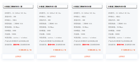 | 香港CN2 | 2核 | 2G | 20M | 1000G | 90G | kvm | ¥388/年 |