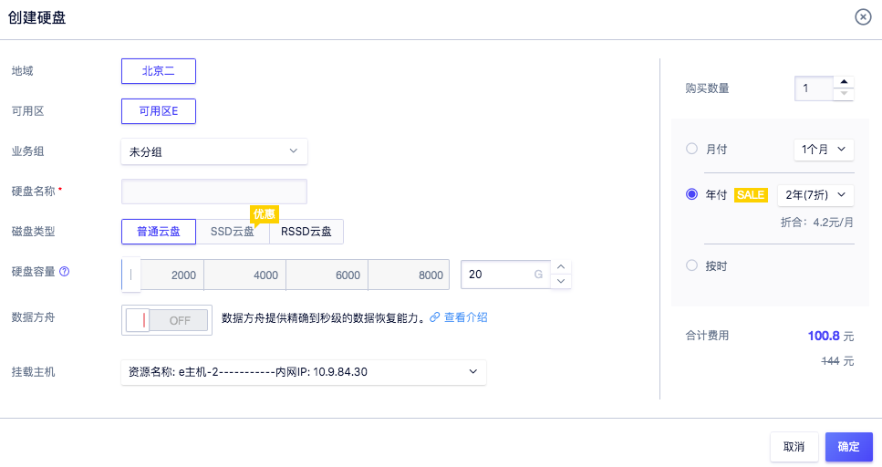 控制台主机创建页以及云盘创建页,均可看到优惠明细以及金额。