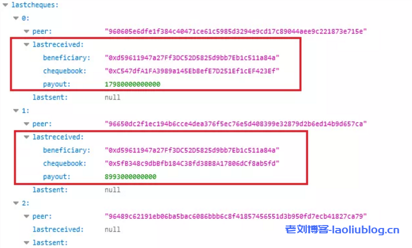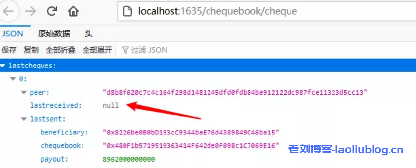 查询支票:http://localhost:1635/chequebook/cheque,如下图,lastreceived:null 表示还没收到支票。