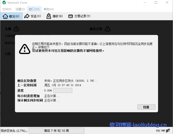 3,点击OK之后,就是一个比较漫长的安装等待过程了(真的很久,会长期停留在安装界面毫无动静,而且记得关闭杀毒软件,不然会各种拦截),安装完成后,就会开始漫长的区块同步,大概有5G。