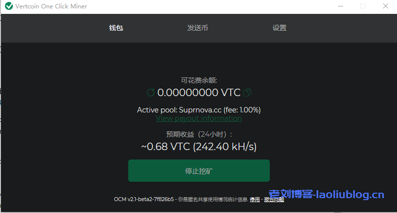 4,挖出来的币可以直接通过发送按钮发送到自己的钱包里面,也可以直接发送去支持VTC的交易所。