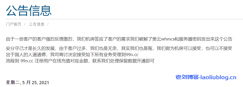 大海数据http://99n.cc/跑到客户樊云的官网上发这么一通公告,老刘博客认为是不道德的,有违原则的:破解别人账密,自己承认自己,病句连篇,变相打广告,实锤樊云可以告他了!